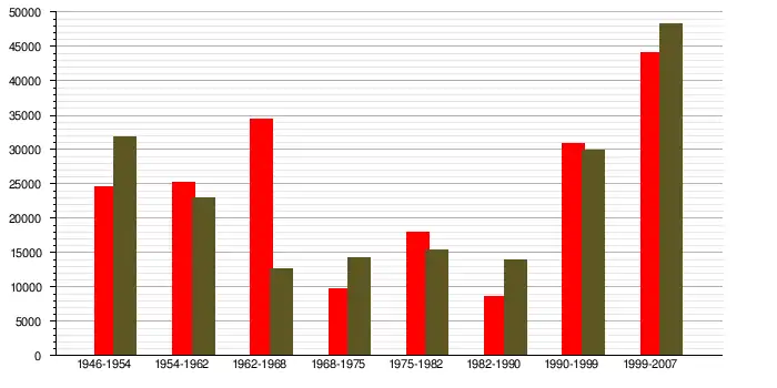 | 1968 à1975 | 1975 à1982 | 1982 à1990 | 1990 à1999 | 1999 à2009 | 2009 à2014 | 2014 à2020 | |