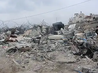 Le comité israélien contre les démolitions de maisons a estimé qu'Israël avait rasé 49 532 structures palestiniennes en 2019[1]. Officiellement, les démolitions de maisons administratives sont effectuées pour faire respecter les codes et réglementations du bâtiment qui, dans les territoires palestiniens occupés, sont établis par l'armée israélienne[2]. Les critiques affirment qu'ils sont utilisés comme un moyen de judaïser des parties du territoire occupé, en particulier Jérusalem-Est[note 1]. Les démolitions punitives de maisons consistent à démolir les maisons de Palestiniens ou de voisins et de parents de Palestiniens soupçonnés d'actes violents contre des Israéliens. Celles-ci ciblent les maisons où vivent les suspects. Les partisans de la méthode affirment qu'elle dissuade contre la violence [4],[5],[6],[7] tandis que les critiques affirment qu'elle n'a pas été prouvée efficace et pourrait même déclencher plus de violence[8]. Les démolitions punitives de maisons ont été critiquées par des organisations de défense des droits de l'homme comme une forme de punition collective et donc comme un crime de guerre au regard du droit international public[note 2].