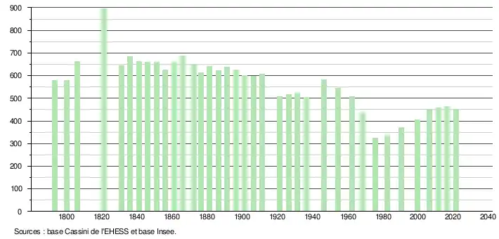 L'évolution du nombre d'habitants est connue à travers les recensements de la population effectués dans la commune depuis 1793. Pour les communes de moins de 10 000 habitants, une enquête de recensement portant sur toute la population est réalisée tous les cinq ans, les populations légales des années intermédiaires étant quant à elles estimées par interpolation ou extrapolation[22]. Pour la commune, le premier recensement exhaustif entrant dans le cadre du nouveau dispositif a été réalisé en 2006[23].