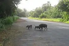 Phacochères traversant la route goudronnée près de Kédougou