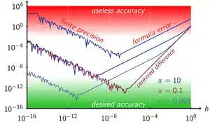 Pour les différences centrales de base, le pas optimal est la racine cubique de l'epsilon machine[7]. Pour la formule de dérivée numérique évaluée en x et x + h, un choix pour h qui est petit sans produire une grande erreur d'arrondi est √ε x (mais pas quand x = 0), où l'epsilon machine ε est typiquement de l'ordre de 2,2 × 10−16 pour la double précision[8] . Une formule pour h qui équilibre l'erreur d'arrondi contre l'erreur sécante pour une précision optimale est[9]