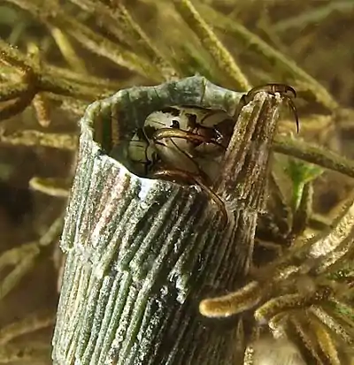 - Stress thermique. Une température inhabituelle ment chaude de l'eau augmente la dérive, mais avec des seuils de sensibilité variant selon les espèces et leur stade de développement. Cet effet a par exemple étudié pour le gammare Gammarus pseudolimnaeus Bousfield et pour Baetis vagans par Wojtalik & Waters (1970)[29] ; Les quelques espèces qui dérivent principalement de jour semblent le faire notamment sous le contrôle de la température de l’eau[30] ;