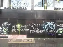 À l'occasion de l'« acte 18 » du , le lendemain de la fin du grand débat national, de nombreux Gilets jaunes se rassemblent à Paris pour marquer le quatrième mois de leur mobilisation. La journée est marquée par le retour dans la capitale d'importantes violences[152] : quand selon Le Monde « de plus en plus de manifestants considèrent que la casse est le seul moyen de se faire entendre et de faire plier le gouvernement »[153], des casseurs et un black bloc de plus de 1 500 personnes[154] tentent de prendre d'assaut l'Arc de triomphe de l'Étoile, et pillent ou dégradent 216 commerces[155], dont la brasserie le Fouquet's et les kiosques à journaux qui sont tous saccagés et pour la plupart incendiés[156]. Les actions ciblent le capitalisme à travers les banques, les grandes marques, mais aussi l'État et ses forces de l'ordre[157]. Selon le secrétaire général de l’UNSA Police, les forces de l’ordre étaient « en mesure d'intervenir » mais n’ont pas été « autorisées à le faire »[158].