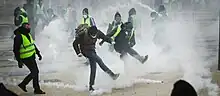 Le , entre 7 000 et 10 000 pompiers manifestent à Paris contre leurs conditions de travail ; à la fin de la manifestation, des heurts éclatent, blessant trois pompiers[183], dont un grièvement blessé à l'œil[184]. Des Gilets jaunes manifestent en soutien aux pompiers le 19 octobre[185],[186].