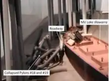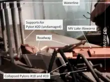 Malgré plusieurs changements de trajectoire, le bateau ne pouvait plus manœuvrer du fait de sa vitesse insuffisante, compte tenu du courant. En désespoir de cause, le capitaine ordonna de faire « arrière toute », mais au moment où tout contrôle était perdu. Le bateau dériva vers le pont, qu'il heurta à mi-distance entre le passage central et le passage latéral à l'est, écrasant les piles 18 et 19 et emportant trois travées et 127 mètres du tablier qui supportait la route. Celle-ci s'écrasa dans la rivière et sur le pont du navire en dessous. Le navire bascula sur tribord et coula en quelques minutes par 35 mètres de fond, à faible distance, un peu au sud du pont. Sept membres de l'équipage restèrent prisonniers de la coque et se noyèrent. L'enquête de la Cour de justice maritime montra ensuite que le capitaine n'avait pas observé les règles maritimes de façons satisfaisantes et il fut suspendu pour six mois[1].
