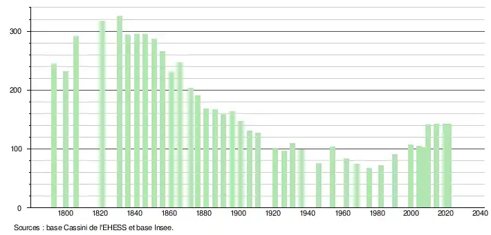 L'évolution du nombre d'habitants est connue à travers les recensements de la population effectués dans la commune depuis 1793. Pour les communes de moins de 10 000 habitants, une enquête de recensement portant sur toute la population est réalisée tous les cinq ans, les populations légales des années intermédiaires étant quant à elles estimées par interpolation ou extrapolation[16]. Pour la commune, le premier recensement exhaustif entrant dans le cadre du nouveau dispositif a été réalisé en 2004[17].