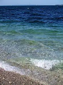 Vue du détroit de l'île Mackinac. En haut, le pont Mackinac est faiblement visible.