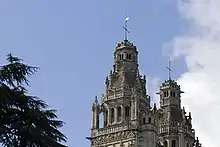 - Cette tour flamboyante « porte à son sommet une plate-forme bordée d'une balustrade de style Renaissance à petits pilastres. Sur cette plate-forme s'élève un étage octogone entouré de quatre clochetons formés de colonnettes. Au-dessus de l'étage octogone, nouvelle balustrade ; puis un dôme, puis des lanternons à deux étages évidés de baies ; enfin un petit dôme très bas ». Cf. Denise Jalabert, Clochers de France, A. et J. Picard et Cie, , p. 78.