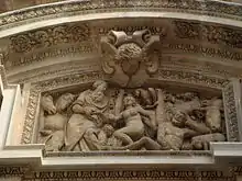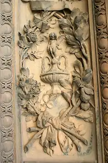 Sur la façade les reliefs illustrent (en partant de la base externe gauche) :