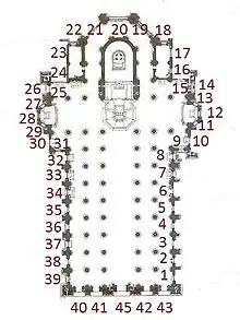 L’intérieur est à cinq nefs et trois transepts. Le chœur est profond et encerclé par un déambulatoire à côté duquel s’ouvrent les deux sacristies. La nef centrale est deux fois plus large que les nefs latérales, celles-ci sont légèrement décroissantes en hauteur ce qui permet l'ouverture de petits vitraux à arcs-boutants au-dessus les arches des voûtes illuminent l'intérieur de manière douce et diffuse[3].