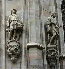 La caractéristique particulière du Duomo de Milan, en plus de son compromis entre la verticalité de la forme gothique et l'horizontalité de la tradition lombarde, est l’extraordinaire abondance de sculptures[1]. C’est une exceptionnelle collection de statues allant du XIVe au XXe siècle et sculptées par de grands maîtres : maestri campionesi (Giovannino dei Grassi), puis avec un style plus doux et cosmopolite des maîtres bohèmes (Michelino da Besozzo), puis sculptures de la Renaissance, baroque, néoclassique pour finir sur des œuvres Art déco des années 1920 et 1930[3].