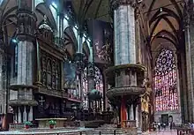 Entre les deux piliers se trouvent les grandes orgues. Derrière s’ouvre le chœur des chanoines (1986) avec le Temple (ciborium) de Pellegrino Tibaldi, puis le tabernacle cylindrique à tours, donné en 1591 par Pie IV. Le ciborium détermine aussi la limite avec la chapelle et l’autre section du presbytérium. Il s’agit d’un espace séparant et recueillant réalisé en 1986 dans l’ancien presbytérium et dans le chœur, où les fidèles peuvent être accueillis durant la liturgie de la semaine[3].