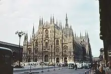 La cathédrale de Milan vue depuis le nord-ouest sur la piazza del Duomo. | |