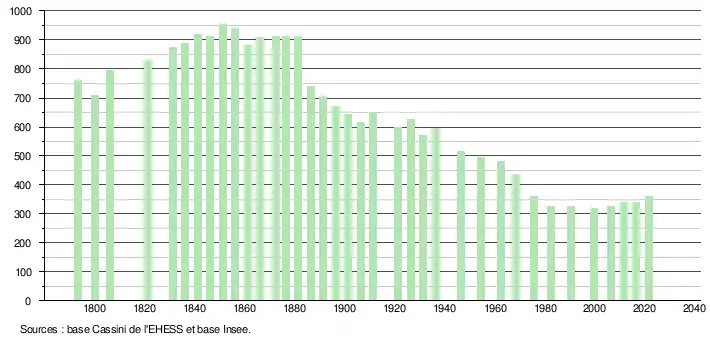 L'évolution du nombre d'habitants est connue à travers les recensements de la population effectués dans la commune depuis 1793. Pour les communes de moins de 10 000 habitants, une enquête de recensement portant sur toute la population est réalisée tous les cinq ans, les populations légales des années intermédiaires étant quant à elles estimées par interpolation ou extrapolation[18]. Pour la commune, le premier recensement exhaustif entrant dans le cadre du nouveau dispositif a été réalisé en 2006[19].