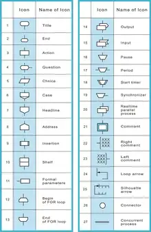 La base de la syntaxe graphique est un alphabet graphique. Les éléments graphiques (lettres graphiques) de l'alphabet DRAKON sont appelés icônes (non pas symboles). il existe 27 icônes dans l'alphabet graphique DRAKON.