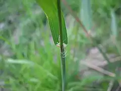 Les feuilles souvent un peu rugueuses ont un limbe plan ou canaliculé, de couleur vert bleuâtre, glabre, de 10 à 45 cm de long et relativement large (2 à 14 mm) et une gaine carénée aplatie. La ligule, assez longue et échancrée, est membraneuse, dentelée et non-ciliée[7]. Les innovations basales sont flabellées (préfoliaison pliée)[8].