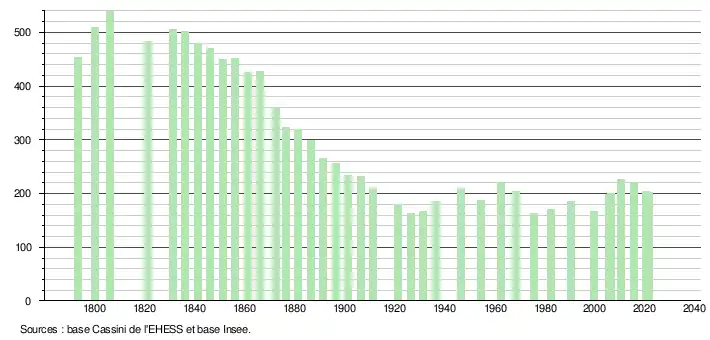 L'évolution du nombre d'habitants est connue à travers les recensements de la population effectués dans la commune depuis 1793. Pour les communes de moins de 10 000 habitants, une enquête de recensement portant sur toute la population est réalisée tous les cinq ans, les populations légales des années intermédiaires étant quant à elles estimées par interpolation ou extrapolation[34]. Pour la commune, le premier recensement exhaustif entrant dans le cadre du nouveau dispositif a été réalisé en 2005[35].