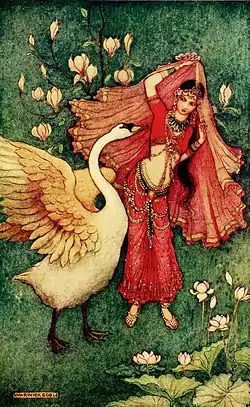 Damayanti tombe amoureuse de Nala sans le connaître et sombre dans la mélancolie. Son père décide alors de convoquer tous les souverains du pays à une fête du svayamvara (स्वयंवर, « choix personnel », la fête des fiançailles au cours de laquelle elle devra choisir son époux).