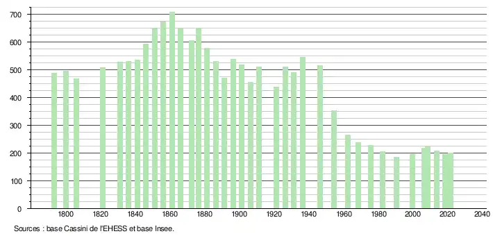 L'évolution du nombre d'habitants est connue à travers les recensements de la population effectués dans la commune depuis 1793. Pour les communes de moins de 10 000 habitants, une enquête de recensement portant sur toute la population est réalisée tous les cinq ans, les populations légales des années intermédiaires étant quant à elles estimées par interpolation ou extrapolation[14]. Pour la commune, le premier recensement exhaustif entrant dans le cadre du nouveau dispositif a été réalisé en 2008[15].