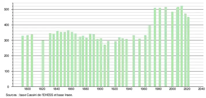 L'évolution du nombre d'habitants est connue à travers les recensements de la population effectués dans la commune depuis 1793. Pour les communes de moins de 10 000 habitants, une enquête de recensement portant sur toute la population est réalisée tous les cinq ans, les populations légales des années intermédiaires étant quant à elles estimées par interpolation ou extrapolation[24]. Pour la commune, le premier recensement exhaustif entrant dans le cadre du nouveau dispositif a été réalisé en 2007[25].