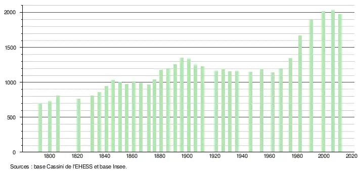 | L'évolution du nombre d'habitants est connue à travers les recensements de la population effectués dans la commune depuis 1793. À partir du , les populations légales des communes sont publiées annuellement dans le cadre d'un recensement qui repose désormais sur une collecte d'information annuelle, concernant successivement tous les territoires communaux au cours d'une période de cinq ans. Pour les communes de moins de 10 000 habitants, une enquête de recensement portant sur toute la population est réalisée tous les cinq ans, les populations légales des années intermédiaires étant quant à elles estimées par interpolation ou extrapolation[5]. Pour la commune, le premier recensement exhaustif entrant dans le cadre du nouveau dispositif a été réalisé en 2006[6],[Note 1]. En 2013, la commune comptait 2 016 habitants, en diminution de −0,74 % par rapport à 2008 (Eure : 2,59 %, France hors Mayotte : 2,49 %). |