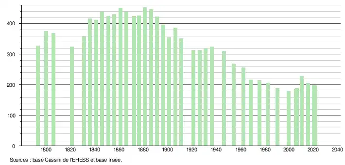 L'évolution du nombre d'habitants est connue à travers les recensements de la population effectués dans la commune depuis 1793. Pour les communes de moins de 10 000 habitants, une enquête de recensement portant sur toute la population est réalisée tous les cinq ans, les populations légales des années intermédiaires étant quant à elles estimées par interpolation ou extrapolation[20]. Pour la commune, le premier recensement exhaustif entrant dans le cadre du nouveau dispositif a été réalisé en 2005[21].