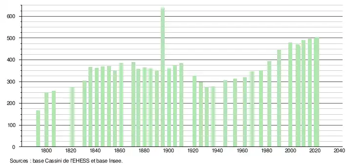 L'évolution du nombre d'habitants est connue à travers les recensements de la population effectués dans la commune depuis 1793. Pour les communes de moins de 10 000 habitants, une enquête de recensement portant sur toute la population est réalisée tous les cinq ans, les populations légales des années intermédiaires étant quant à elles estimées par interpolation ou extrapolation[15]. Pour la commune, le premier recensement exhaustif entrant dans le cadre du nouveau dispositif a été réalisé en 2005[16].