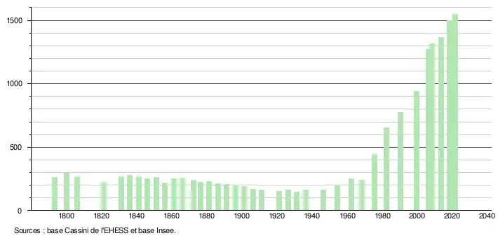 L'évolution du nombre d'habitants est connue à travers les recensements de la population effectués dans la commune depuis 1793. Pour les communes de moins de 10 000 habitants, une enquête de recensement portant sur toute la population est réalisée tous les cinq ans, les populations légales des années intermédiaires étant quant à elles estimées par interpolation ou extrapolation[14]. Pour la commune, le premier recensement exhaustif entrant dans le cadre du nouveau dispositif a été réalisé en 2008[15].