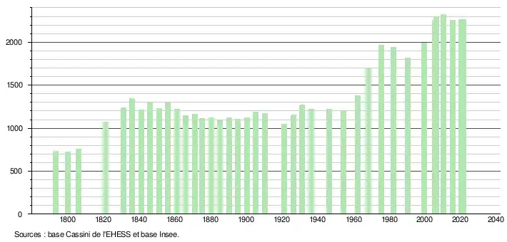 L'évolution du nombre d'habitants est connue à travers les recensements de la population effectués dans la commune depuis 1793. Pour les communes de moins de 10 000 habitants, une enquête de recensement portant sur toute la population est réalisée tous les cinq ans, les populations légales des années intermédiaires étant quant à elles estimées par interpolation ou extrapolation[28]. Pour la commune, le premier recensement exhaustif entrant dans le cadre du nouveau dispositif a été réalisé en 2005[29].