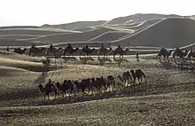 Sur une longue note tenue dans l'aigu des violons (évoquant le désert) et la clarinette expose le thème du chant russe. Le cor le reprend plus grave en lui ajoutant le sentiment d'une chose lointaine. Un rythme régulier (évoquant la marche de la caravane en Asie centrale) naît aux cordes (pizzicati) et se maintiendra pendant presque toute l'œuvre. Le second thème, un chant oriental très mélancolique, est joué par le cor anglais. La caravane passe devant nous. Le thème russe présenté aux bois puis aux cors éclate presque brutalement. Enfin, les deux mélodies se superposent. Le diminuendo reprend des fragments du thème russe qui retentit une dernière fois à la flûte sur une note tenue aiguë, comme au début du morceau.