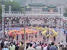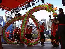Une double danse du dragon (rarement montrée en Occident) met en jeu deux troupes de danseurs entrelaçant leurs dragons. Plus rarement encore, on assiste parfois à des performances mettant en jeu les neuf dragons traditionnels[18] (neuf symbolisant la perfection) ; de telles danses, demandant un grand nombre de participants venant de plusieurs organisations, ne sont possibles que sous le patronage d'un gouvernement régional ou national.
