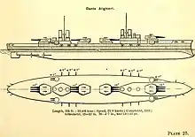 Le Dante Alighieri dispose en outre sur la ligne de flottaison d'une ceinture blindée allant jusqu'à 254 mm d'épaisseur. Le pont blindé du navire est quant à lui épais de 38 mm. Les tourelles principales sont protégées par un blindage de 254 mm d'épaisseur au maximum tandis que celui des tourelles secondaires et des casemates est de 98 mm. Enfin, le château est recouvert par des plaques de blindage de 305 mm d'épaisseur[1]. Les batteries de moyens calibres disposées en tourelles au lieu de batteries constituent une importante innovation pour l'époque. De plus, c'est le premier navire italien à être propulsé par quatre hélices. Vers 1913, un hydravion de reconnaissance Curtiss est installé à bord du Dante Alighieri. En 1915, ses 13 canons de 76 mm/40 sont remplacés par 16 canons de 76 mm/50[7], dont 3 sont utilisés comme canons antiaériens[1].