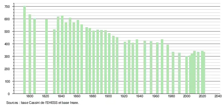 L'évolution du nombre d'habitants est connue à travers les recensements de la population effectués dans la commune depuis 1793. Pour les communes de moins de 10 000 habitants, une enquête de recensement portant sur toute la population est réalisée tous les cinq ans, les populations légales des années intermédiaires étant quant à elles estimées par interpolation ou extrapolation[13]. Pour la commune, le premier recensement exhaustif entrant dans le cadre du nouveau dispositif a été réalisé en 2004[14].
