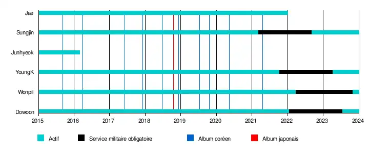 | Jae | 제이 | Park Jae-hyung | 박제형 | Chanteur, rappeur, guitariste principal et hyung (le plus âgé) | |||