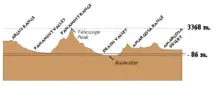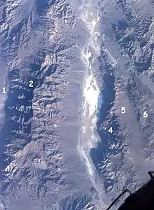 Le parc national de la vallée de la Mort appartient à la région du Grand Bassin qui s'étend à l'est de la Californie et sur la plus grande partie de l'État du Nevada. Le relief est constitué d'une succession presque parallèle de chaînes et de sillons linéaires : dans le parc se succèdent en effet, d'ouest en est, le chaînon Argus, la vallée Panamint, le chaînon Panamint, la vallée de la Mort et le chaînon Amargosa, toutes d'orientation nord-ouest/sud-est. Les secteurs du parc situés en dessous du niveau de la mer représentent une surface totale de 1 500 km2[10]. Le pic Telescope est le point culminant du parc (3 368 mètres). Il se trouve à l'ouest dans la Panamint Range.