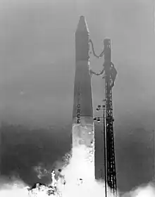 Un lanceur Thor Burner I emportant un satellite DMSP de deuxième génération peu avant son lancement (mai 1965).