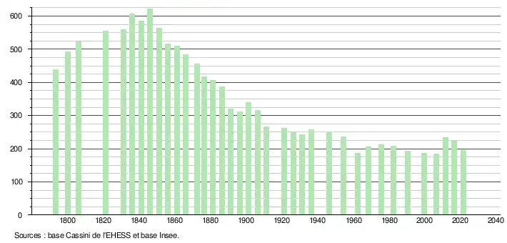 L'évolution du nombre d'habitants est connue à travers les recensements de la population effectués dans la commune depuis 1793. Pour les communes de moins de 10 000 habitants, une enquête de recensement portant sur toute la population est réalisée tous les cinq ans, les populations légales des années intermédiaires étant quant à elles estimées par interpolation ou extrapolation[18]. Pour la commune, le premier recensement exhaustif entrant dans le cadre du nouveau dispositif a été réalisé en 2006[19].