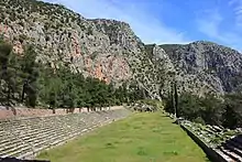 Autour du sanctuaire se trouve la ville de Delphes, qui vivait principalement grâce aux visiteurs du sanctuaire, à partir du VIe siècle av. J.-C.