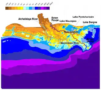 Néanmoins une grande partie de l'immense delta tend à s'enfoncer sous l'eau depuis 80 ans, et de plus en plus rapidement au point que selon la NOAA, plus de 80 % du sud-est de la Louisiane pourrait disparaître avant la fin du siècle. Presque tout le Sud-Est de la Louisiane est concerné[12]. Les cartes faites par la NOAA doivent être régulièrement rectifiées : En 2011, 31 baies et autres lieux-dits de la zone du Plaquemines Parish (nommés par les explorateurs français dans les années 1700) ont ainsi disparu des nouvelles cartes[13]. De 2010 à 2013, l’équivalent d'environ un terrain de football a été perdu en moyenne chaque heure, et la situation devrait empirer[14]. Selon les prévisions 2013-2014 de la NOAA, c'est la zone des États-Unis et du monde qui pourraient être la plus gravement, la plus coûteusement et la plus rapidement envahie par l'océan[15].