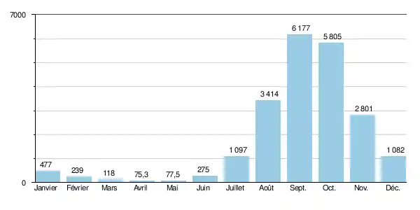 - Les hautes eaux (juillet-octobre) (avec un maximum toujours observé entre fin septembre et mi-octobre)