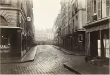 La rue Taranne en 1866 vue par Charles Marville : le logis de Diderot était situé au-dessus du restaurant Laffitte, au no 1, et faisait l'angle avec, à droite, le début de la rue Saint-Benoît.
