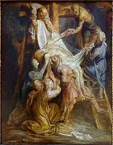 Dix personnages sont représentés sur la toile, dont le Christ, au centre de la composition. On y voit Nicodème et Joseph d'Arimathie, tous deux membres du Sanhédrin, détachant de la croix, avec l'aide d'un serviteur, le corps du Christ soutenu par Jean. Au pied de la croix se trouvent les trois Marie, la Vierge Marie, Marie-Madeleine et Marie Cléophas. Par la gauche, une vieille femme, qui ne figure pas dans l'esquisse préparatoire, entre dans la toile. En arrière-plan, un personnage descend l'échelle sur laquelle est juché Joseph.