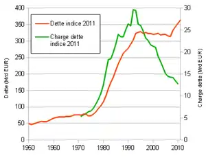 La charge de la dette s'est élevée en 2010 à 12,307 milliards d'euros[3]. Soit 1 135 € par habitant[4] ou 2 765 € par travailleur[5].