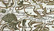 Bien que le rotule colonger[Note 8] de 1380 fasse déjà apparaitre la graphie définitive Dettwiller[27], une carte de Daniel Specklin datant de 1576 mentionne la commune sous le nom de Detwilre[28]. La carte de Cassini, établie vers 1770, indique Dettweiller. Enfin, lors des occupations allemandes (1871-1918 et 1940-1944), le nom du village s'orthographia Dettweiler et parfois Dettweiller[29].
