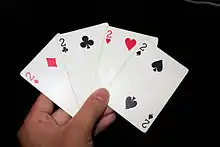 - Jeu de 52 cartes (as, valeurs de 2 à 10, valet, dame et roi) :