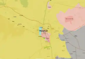 L'État islamique repart à l'assaut le soir du [8]. Les djihadistes attaquent au sud de la ville, sur les positions du régime syrien. Le contrôle de la cité, capitale du gouvernorat d'Hassaké, est alors partagé entre les forces loyalistes syriennes au sud et les Kurdes des YPG et les chrétiens du Conseil militaire syriaque (MFS) au nord et à l'ouest[9].