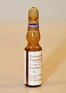 - Ophtalmologie : elle est administrée par voie ophtalmique en instillation oculaire par le biais d'un collyre et peut se trouver notamment sous forme de phosphate de dexaméthasone ;