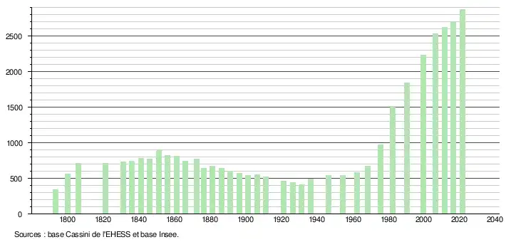L'évolution du nombre d'habitants est connue à travers les recensements de la population effectués dans la commune depuis 1793. Pour les communes de moins de 10 000 habitants, une enquête de recensement portant sur toute la population est réalisée tous les cinq ans, les populations légales des années intermédiaires étant quant à elles estimées par interpolation ou extrapolation[22]. Pour la commune, le premier recensement exhaustif entrant dans le cadre du nouveau dispositif a été réalisé en 2006[23].