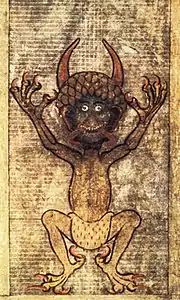 - À partir du Haut Moyen Âge, l’iconographie chrétienne représente le diable comme un être anthropomorphe effrayant, velu, avec des cornes, des griffes et les caractéristiques du bouc (cornes, pieds et queue fourchue), représentations qui proviendraient du folklore de l'incube[17], du dieu romain Pan ou encore des satyres[16]. Cette iconographie ne devient vraiment courante et accessible qu'avec les églises romanes dont la statuaire et les vitraux donnent corps au démon décrit dans les Historiæ du moine Raoul Glaber qui est le premier, au début du XIe siècle, à décrire le diable issu d'un de ses songes comme un être de petite taille, la peau ridée, un visage difforme, le crâne allongé avec un museau de chien et des oreilles hérissées, une barbe de bouc, des griffes, les cheveux sales et raides, les dents d’un chien, une bosse sur le dos, les fesses pendantes, les vêtements malpropres[18].