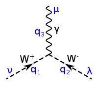 L'interaction faible fait intervenir ses trois bosons de jauge, le boson W dans ses deux états, et , ainsi que le boson [37]. Ces médiateurs sont généralement tracés avec une ligne en pointillés ou une ligne ondulée (la même que celle du photon) annotée avec la lettre du boson correspondant. La ligne droite fléchée s'étend ici aux quarks et aux autres leptons, accompagnée de leur symbole.
